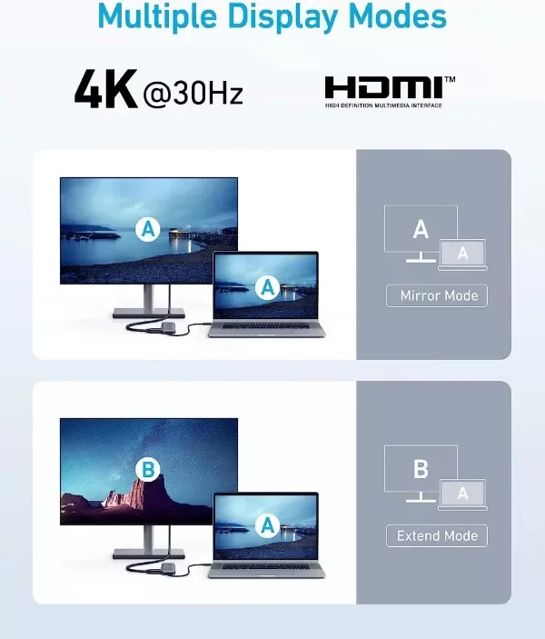Conectividad 5 en 1: equipado con un puerto HDMI 4K, un puerto de datos USB-C de 5 Gbps, dos puertos USB-A de 5 Gbps y un puerto PD-IN de 100 W.