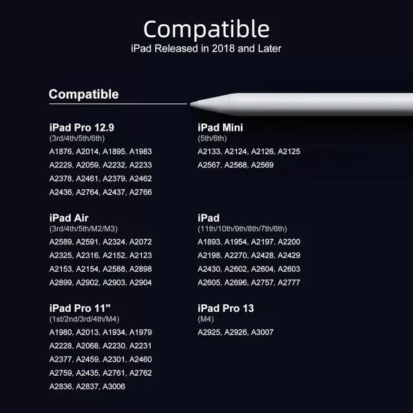 Compatible con iPad y iPad Pro (2018-2025) El lápiz óptico es compatible con los modelos de iPad de la serie 2018-2025: iPad Pro de 13" (M4), iPad Pro de 12,9" (3.ª, 4.ª, 5.ª y 6.ª generación), iPad Pro de 11" (todas las generaciones), iPad Air M3/M2/5.ª, 4.ª y 3.ª generación, iPad 11.ª, 10.ª, 9.ª, 8.ª, 7.ª y 6.ª generación, iPad Mini de 6.ª y 5.ª generación.
